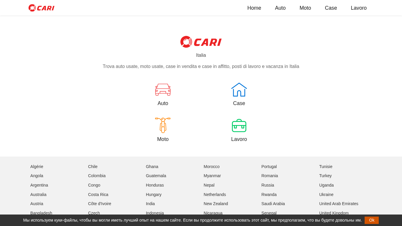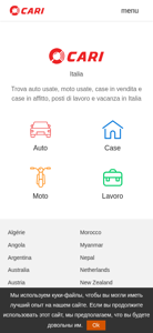 | AI-анализ | The portal Cari.co.it is an Italian marketplace for buying and selling used cars, motorbikes, homes, jobs, and vacations. The website's title and meta description state this explicitly, with keywords such as "auto," "moto," "case," "lavoro," and "italia" appearing frequently. The site is structured around these main categories, with sections for Algeria, Angola, Argentina, and other countries. Users can search for and find various items for sale or rent, and the site also includes a homepage and a contact page. The site uses cookies to improve user experience. |