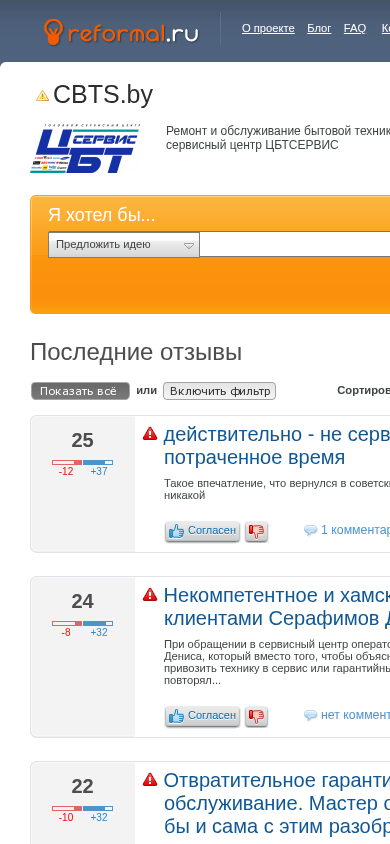 | AI-анализ | The portal CBTS.by is a user review and idea platform for the CBTS project. Visitors are encouraged to share their opinions and suggestions. The website includes a blog, FAQ, contacts, and login functionality. However, the project is not verified, indicating that the official website for CBTS may not be associated with this platform. The primary focus of the site is for repair and maintenance of household appliances, with an authorized service center, CBTSERVIS, providing official representation. Users have reported varying experiences, including unresponsiveness, incompetence, and poor communication with customer service representatives. Some have expressed dissatisfaction with the repair process and delays in scheduling appointments. Despite these concerns, others have reported positive experiences and expressed gratitude for the services provided. The platform also features a system for users to submit and vote on ideas and issues, with various filters for sorting and tracking their status. |