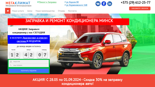 | AI-анализ | This online resource is dedicated to conditioner refills and repairs in Minsk, Belarus. The website offers services at three different locations, with low prices on conditioner and compressor repairs. Professional diagnostics are provided by Megaklimat BA Minsk. The homepage features a 25% discount on conditioner refills, as well as a countdown to the end of the promotion. The website lists reasons for conditioner system failures, such as hermeticity issues, faulty thermoregulating valves, damaged evaporators, faulty pressure sensors, and compressor failures. Users can book repairs or refills by clicking the 'Записаться' button. The website also provides information on the services offered, including conditioner cleaning and disinfection, radiator repairs, and compressor repairs. The time required for conditioner repairs varies depending on the make and model of the vehicle. The website |