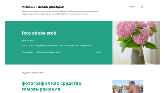 | AI-анализ | This website, titled "Живешь только дважды!", is dedicated to the life experiences and challenges faced by individuals with spinal injuries. The main content includes personal accounts of daily life and problems faced by individuals with spinal injuries, specifically those with paraplegia affecting the lower limbs. The blog discusses topics such as learning to photograph as a means of self-expression, trips to alternative destinations, and experiences with various applications and social media platforms. The author also shares their personal journey of purchasing a good photo camera and learning photography. The website also features a travel post about a trip to Calp, Spain, which was seen as an alternative to a dream trip to Sicily. The post highlights the ease of travel and the peaceful, relaxing atmosphere of the destination, which is suitable for individuals using wheelchairs. The website includes links to Facebook, Pinterest, and email for sharing and commenting, as |