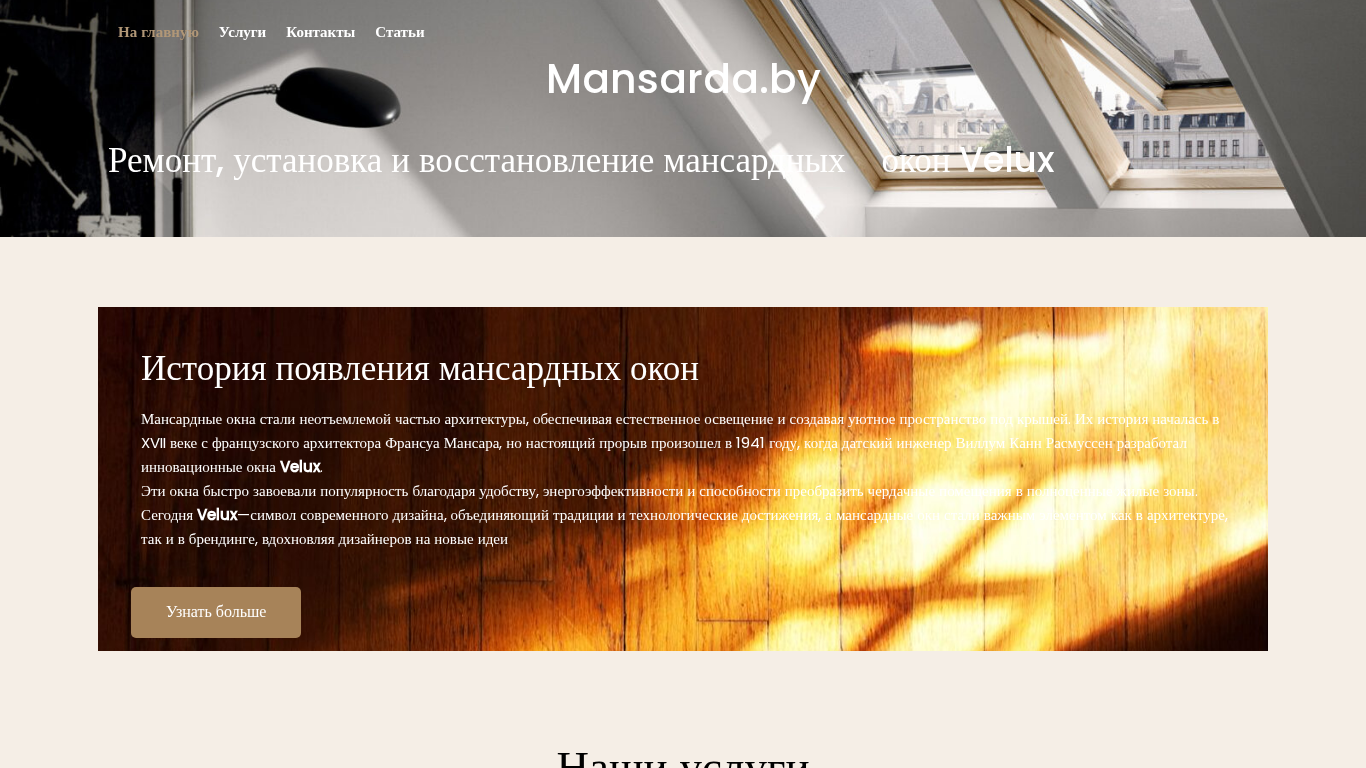 | AI-анализ | The web project Mansarda.by is dedicated to the repair, installation, and restoration of mansard windows, specifically Velux brand windows. Mansard windows, a traditional architectural element, provide natural lighting and create cozy spaces under roofs, dating back to the 17th century. The project's focus on Velux windows began in 1941 when Danish engineer Vilhelm Kann Rasmussen invented innovative Velux windows, which quickly gained popularity for their convenience, energy efficiency, and ability to transform attic spaces into habitable zones. Today, Velux windows represent modern design, combining tradition and technological advancements. The website offers services such as gasket replacement, glass pane replacement, electrical repair, shutter and mosquito net repair, lock repair and installation, and additional sealing for windows without it. Mansarda.by also features client testimonials. |
