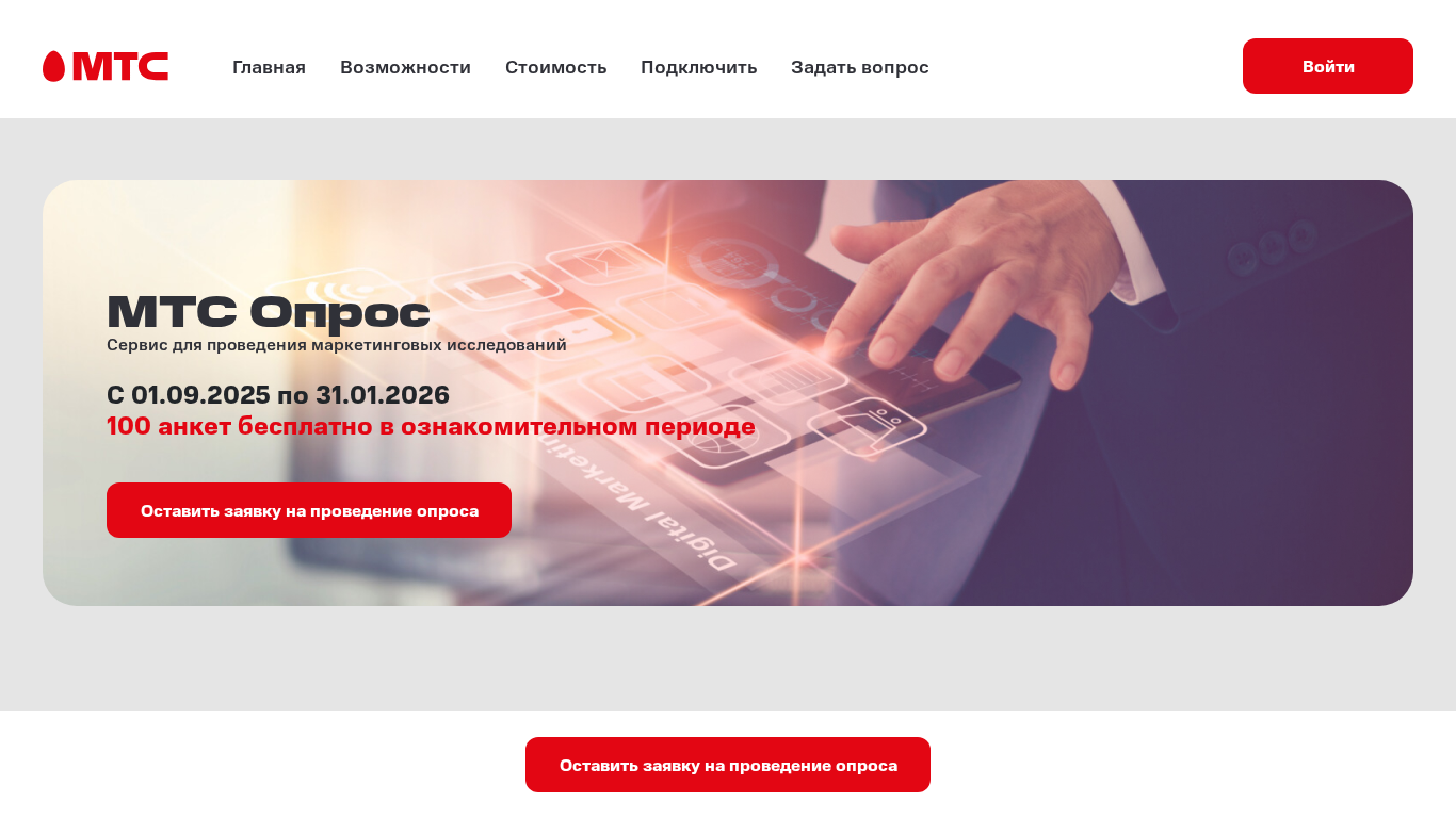 | AI-анализ | The web project "МТС Опрос" is a marketing research service that allows users to create and conduct surveys. The site offers various packages with different numbers of surveys and pricing, ranging from 157 rubles for 5000 surveys to 3025 rubles for 100,000 surveys. Users can also opt for Viber or targeted SMS message campaigns to invite participants, with prices starting at 0.035 rubles for a Viber message and 210 rubles for a targeted SMS campaign in the MTS network. The site includes a personal cabinet for users to view and analyze survey results, as well as templates for NPS and NSAT surveys. Users can add links and images to their surveys and create targeted selections based on specific criteria. The site also offers basic and extended targeting options for audience selection in the case of targeted SMS |