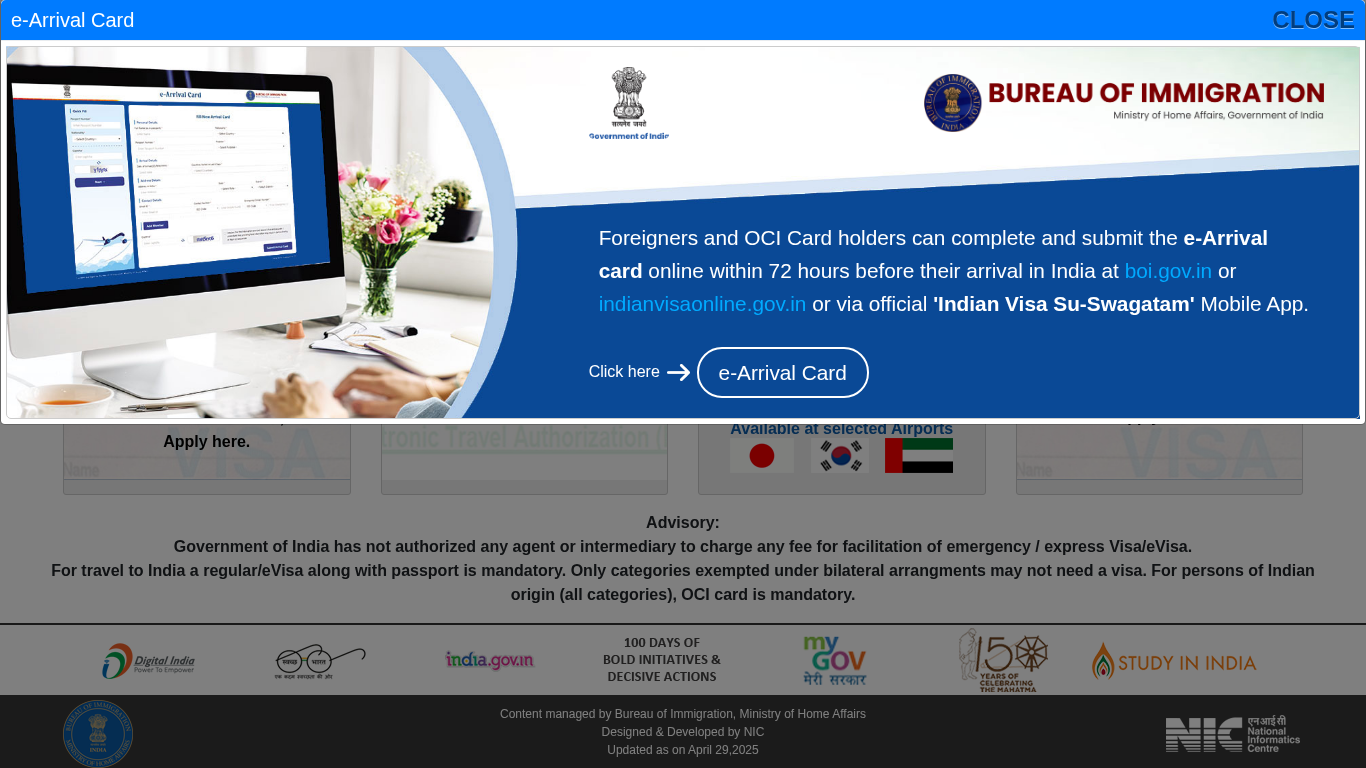 | AI-анализ | This website is the authorized portal for visa application to India by foreign nationals. It is operated by the Bureau of Immigration under the Ministry of Home Affairs. The website provides information and services for applying for both regular visas from Indian Missions/Posts and eVisas from the Bureau of Immigration. The website also offers information on visa categories and requirements, as well as an e-Arrival card for foreigners and OCI card holders to complete and submit online before arrival in India. All foreign nationals entering India are required to possess a valid international travel document and a visa from an Indian Mission/Post or eVisa. The website is designed and developed by NIC and is updated regularly. It is important to note that no agent or intermediary is authorized by the Government of India to charge a fee for facilitation of emergency/express Visa/eVisa. |