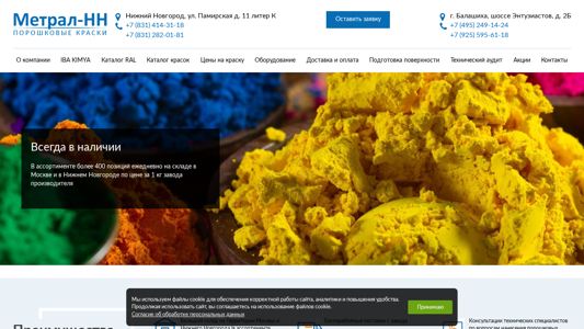 | AI-анализ | --- The web project "Metral-NN.ru" is an online store for buying powder coating paint in Nižnyj Novgorod and Moscow. It offers a wide range of colors, textures, and finishes, with over 100 RAL shades available in a matte finish. The store also sells equipment for powder coating, including Turkish Electron TESLA and German GEMA installations. Customers can place orders in Bašašiha or leave a request in Moscow or Nižnyj Novgorod. The company, IBA KIMYA, also provides technical audits and actions. The website features a catalog of RAL and architectural paints, as well as various metallic finishes under the Qualicoat brand. Other offerings include matte, burlap and silk finishes, and the latest bright colors. Prices are based on |