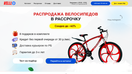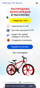 | AI-анализ | The website is an online bicycle shop specializing in the sale of mountain bikes and electric bicycles in Belarus. They offer discounts of up to 40% and delivery throughout Belarus. Customers can place orders for bicycles with large wheels and purchase a fat bike on installment without the first payment. The shop's catalog is available, along with information on financing, reviews, delivery, and contact details. The shop is located in Minsk, with addresses on Timiryazeva Street 65a and Kropotkin Street 59. The shop offers an additional discount of 20 rubles, and customers can purchase a bicycle in a box and assemble it themselves, with a discount of 20 rubles on any model. The website provides a test for selecting a bike, and there is a sale with a discount of 29%, as well as eight free |