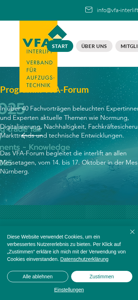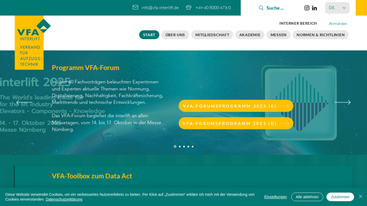 | AI-анализ | language: de The portal VFA Interlift e.V. is the international association for elevator technology. We promote exchange, further education, and innovation in the elevator industry. Discover more on our homepage. The site contains information about the association's activities, including its forum, academy, and membership benefits. The VFA Interlift hosts the interlift trade fair in Nuremberg and is actively involved in national and international legislation and standardization. The association's forum offers over 40 expert presentations on topics such as norming, digitalization, sustainability, workforce security, market trends, and technical developments. It accompanies the interlift fair at all its dates, including October 14-17 in Nuremberg. The site also provides information about the VFA toolbox, which assists members in complying with the European Data Act from September 20 |