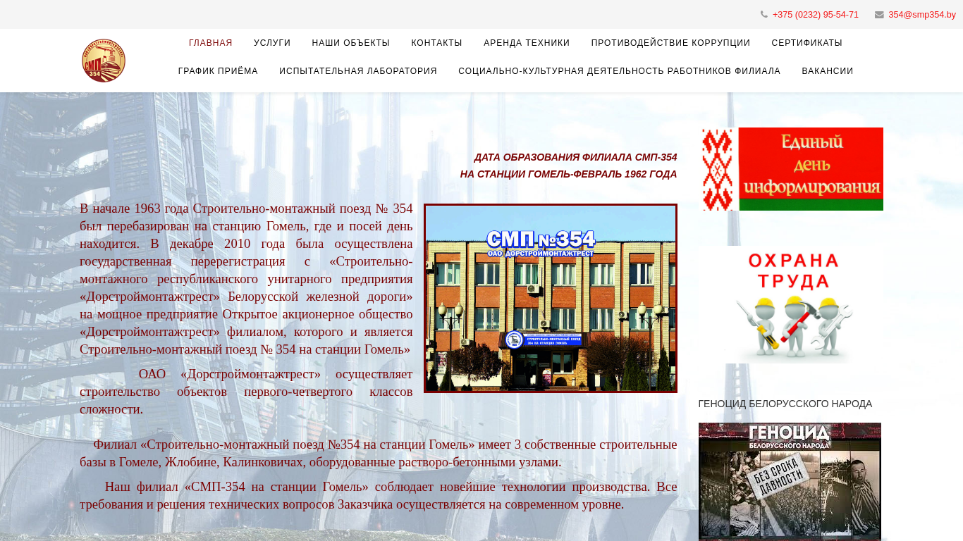 | SEO-лексика | 354 гомель станции дорстроймонтажтрест года строительно-монтажный поезд главная 375 95-54-71 smp354 контакты филиала смп-354 оао осуществляет строительство объектов первого-четвертого классов |