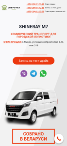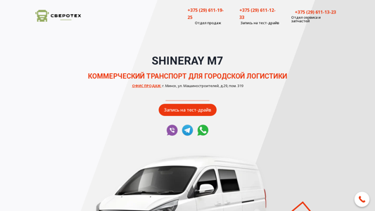| AI-анализ | The portal is a commercial vehicle sales website focused on the Shineray M7 model in Minsk, Belarus. The offered vehicle is a commercial transport Shineray M7 with a 2.0L/110kW/150hp engine, a rear-wheel drive, and a mechanical transmission. The vehicle's dimensions are 4890x1700x1995mm, and it has a cargo compartment size of 2510x1475x1350mm or 5 m³. The Shineray M7 is available in cargo, passenger, and cargo-passenger configurations, with options for 2, 7, or 9 seats, priced at 74,900, 74,400, and 77,400 BYN, respectively. The website provides |