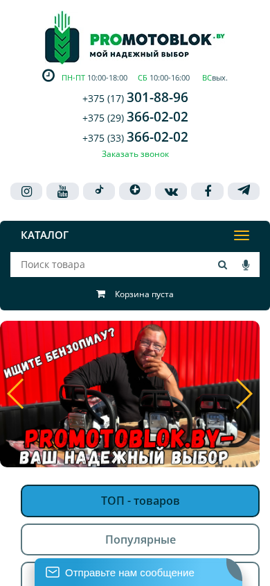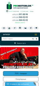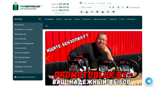 | AI-анализ | This website, Promotoblok.by, offers for sale agricultural, gardening, and farm equipment in Minsk, Gomel, Grodno, Vitebsk, Brest, and Moгилев. The equipment is available for purchase with financing, credit, or leasing. Delivery is available throughout Belarus. The website has a catalog of various types of motoblocks, mini-tractors, monoblocks, and attachments for them. The top keywords include "купить" (buy), "наличии" (availability), "закладки" (wishlist), "мотоблоки" (motoblocks), and "двигателем" (with engine). The phone numbers for inquiries are provided, as well as an option to request a callback. The catalog includes a variety of motoblocks, mini- |