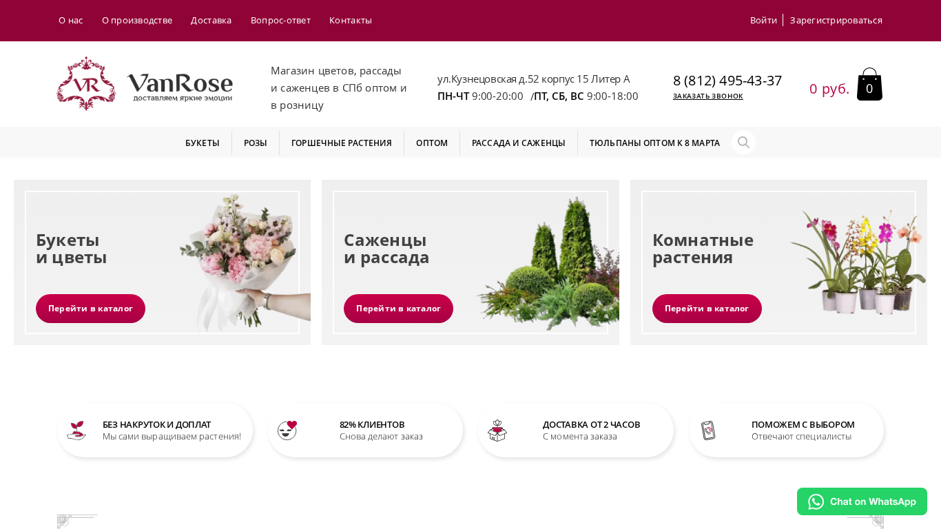 | SEO-описание | Цветы и комнатные растения выгодной цене в магазине Vanrose. ⭐️Доставка по СПб и области от 2 часов! ⚡Собственный питомник. ✨Рассада и саженцы на заказ. |