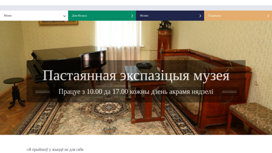 | AI-анализ | The portal yakubkolas.by is the official website of the State Literary and Memorial Museum of Jacob Collaso in Minsk, Belarus. The website title translates to "Jacob Collaso - State Literary and Memorial Museum of Jacob Collaso" and contains information about the museum's history, exhibitions, educational projects, partnerships, and administrative procedures. Keywords associated with the website include 'коласа', 'якуба', 'музея', 'музей', 'дзяржа', and 'экспаз'. The menu offers sections for 'Home', 'Specials', 'Calendar', 'Photo Gallery', 'Questionnaire', 'History of the Museum', 'Visiting Information', 'Collections', 'Exhibitions of the Museum of Jacob Collaso in Minsk', 'Biography of Jacob Collaso', 'Library', 'Stud |
