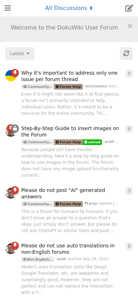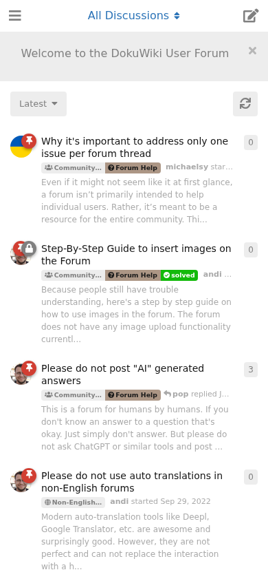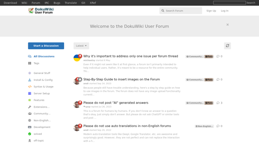 | AI-анализ | The portal is the DokuWiki User Forum, a community space for discussions, questions, and answers related to the open-source wiki software DokuWiki. This forum provides a platform for users to seek help, share experiences, and exchange knowledge on various topics, including plugins, extensions, syntax, installation, and configuration. It also features dedicated sections for community interactions, non-English discussions, and forum help. The forum's rules emphasize addressing only one issue per thread and discourage the use of AI-generated answers or auto translations in non-English forums. Users can find step-by-step guides, formatting instructions, and solutions to common problems in the forum's help section. |