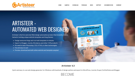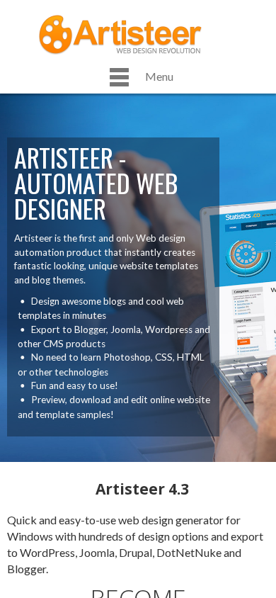 | AI-анализ | The website Artisteer is a software platform designed for creating unique website templates and blog themes through automation. Users can produce designs for various content management systems (CMS) like Blogger, Joomla, WordPress, and Drupal, among others. The software offers hundreds of design options and allows users to become web design experts without needing extensive technical knowledge. The site includes a free trial and demo for users to preview and download samples. Artisteer is not affiliated with or endorsed by the Joomla!, Drupal, or WordPress projects. |