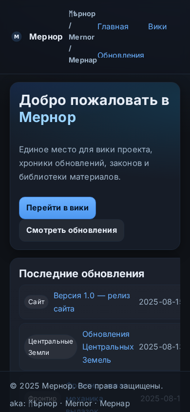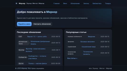 | AI-анализ | language: ru This website, titled "Мернор" (Mernor), is a Russian-language platform dedicated to a viki project, chronicles of updates, laws, and a library of materials. The homepage presents a central hub for users to access the wiki, view recent updates, and explore various categories such as "Центральные Земли" (Central Lands) and "Фронтир" (Frontier). The site was released on August 15, 2025, and includes popular articles on gaming features, mechanics, and rules. Users can also find articles on technical aspects and limitations. All content is copyrighted by Mernor. |