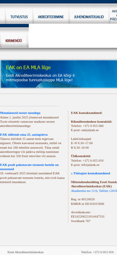 | AI-анализ | --- The web project "Eesti Akrediteerimiskeskus" (EAK) is the Estonian Accreditation Centre, offering services related to accreditation and certification in various fields. According to the website's data, the most frequently used keywords include 'eak', 'eesti', 'akrediteerimiskeskus', 'juhendid', 'sertifitseerimisasutused', 'teenuste', 'telefon', '372', '055', 'e-post', 'ilac', 'iaf', 'liikmelisus', 'kus', 'asume', 'juhtimiss', 'mis', 'akrediteerimine', 'mida', 'akrediteeritakse', 'miks', 'kes', 'akrediteerimiskriteerium |