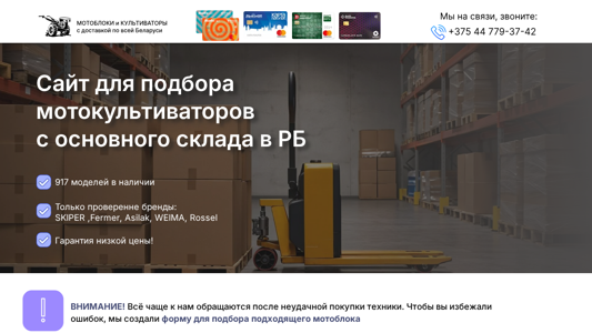 | SEO-описание | 4 из 5 покупателей выбирают неподходящий мотоблок и теряют время, силы и урожай. Мы бесплатно подберём мотоблок или культиватор с нужной мощностью и навесным оборудованием под ваш участок, почву и задачи. Доставка и запчасти в наличии. |