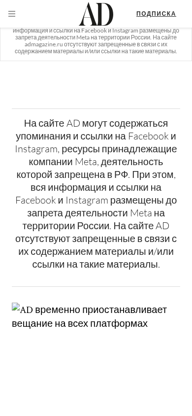 | AI-анализ | The web project "Archiтектура и дизайн | AD Magazine" is an international leading journal about architecture and interior design. It can contain mentions and links to Facebook and Instagram, resources owned by Meta, whose activities are banned in RF. All information and links to Facebook and Instagram are placed prior to Meta's ban on Russian territory. The website does not contain any prohibited materials or links to such materials. The magazine's content includes texts, photo reports, interior stories, useful tips for home decoration, videos, and podcasts, all of which are accessible on the site. For instance, there are stories about a flat in a guarded building from the 1940s, designed by a stylist and an art collector, and a flat for a DJ son, with a focus on unity and consistency in materials and forms to achieve harmony. |