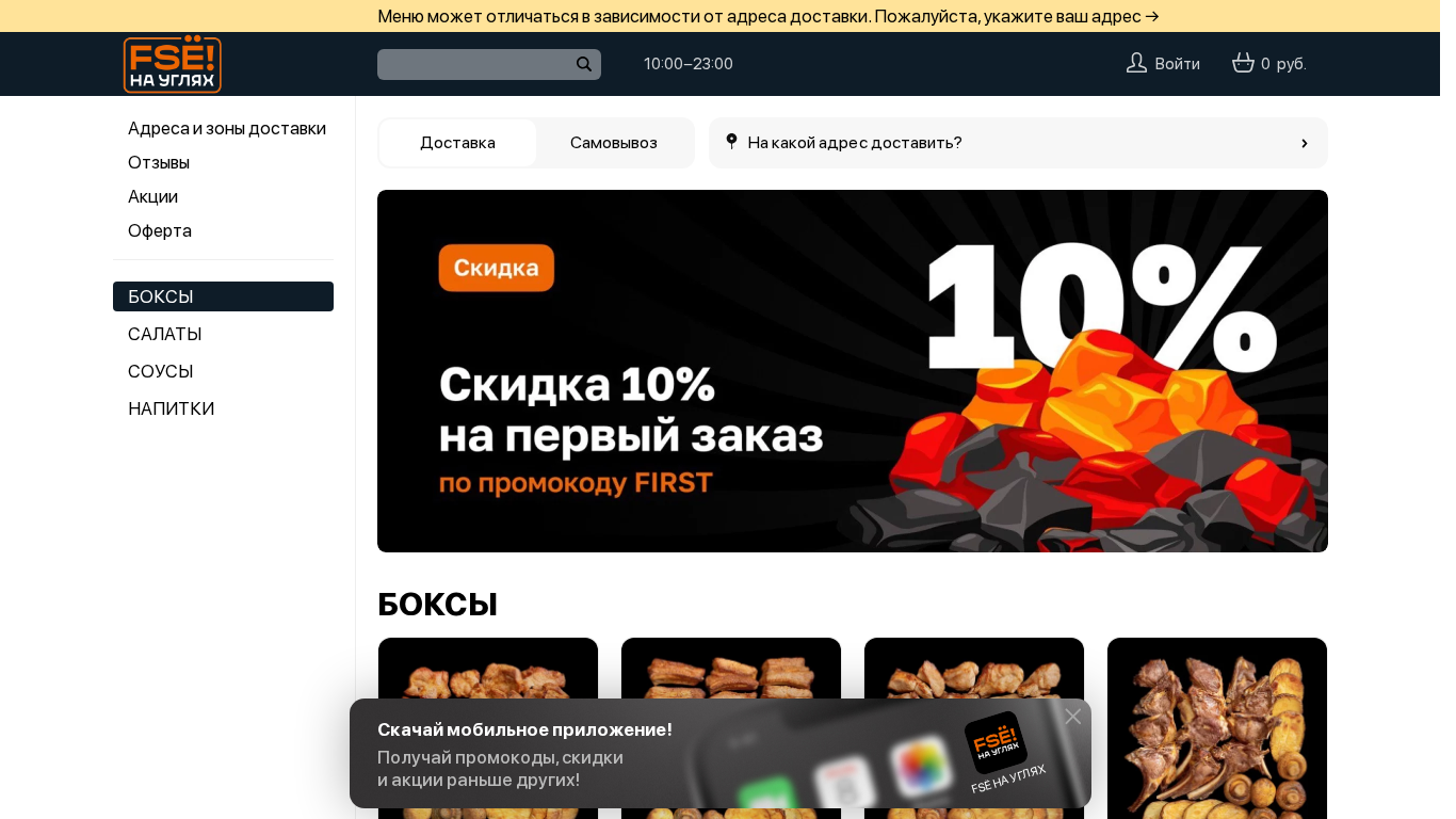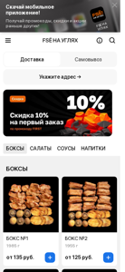 | AI-анализ | The portal FSЁ НА УГЛЯХ Минск offers a menu that may vary depending on the delivery address. Please specify your address. The restaurant operates from 10:00 to 23:00. The website lists several boxes with different options for dishes. Each box contains various quantities of meat, potatoes, vegetables, and lavash bread. Box 1, created in 1985, includes swine neck, 1110g of potatoes, 250g of mushrooms, 150g of lavash, and 75g of onion/greens for 135 rubles. Box 2, from 1955, has pork ribs, 1080g of potatoes, 250g of mushrooms, 150g of lavash, and 75g of |