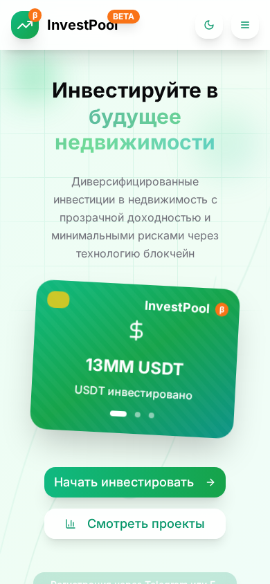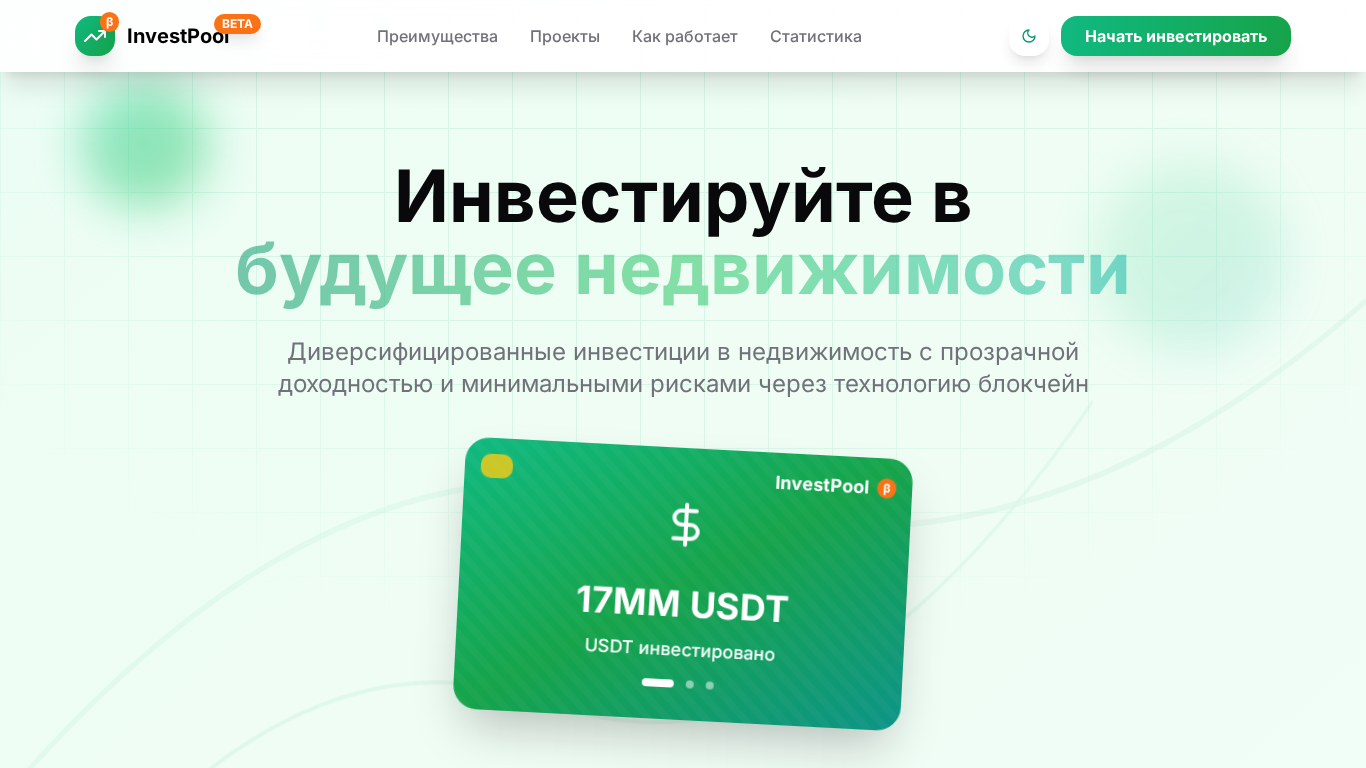 | AI-анализ | The web project InvestPool is a contemporary platform for real estate investments with a crowdfunding model. Users can invest from 1000 RUB (approximately 13 USD) in commercial and residential properties, with potential returns of up to 25% per year. The platform prioritizes transparency and reliability. Keywords associated with the site include real estate investments, crowdfunding, property projects, passive income, commercial real estate, residential real estate, returns, investment platform. The site features a registration process through Telegram or email, with a minimum investment of 100 USDT. It boasts a stable growth, client trust, and leads the market in blockchain safety. Users can start investing with HD wallets, which offer personal control over funds, and benefit from Telegram bots, instant notifications, and a low entry barrier. The platform provides full transparency with detailed |