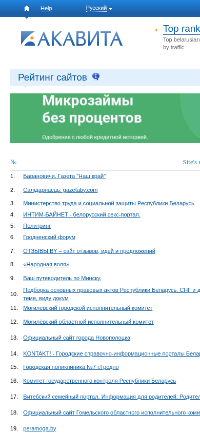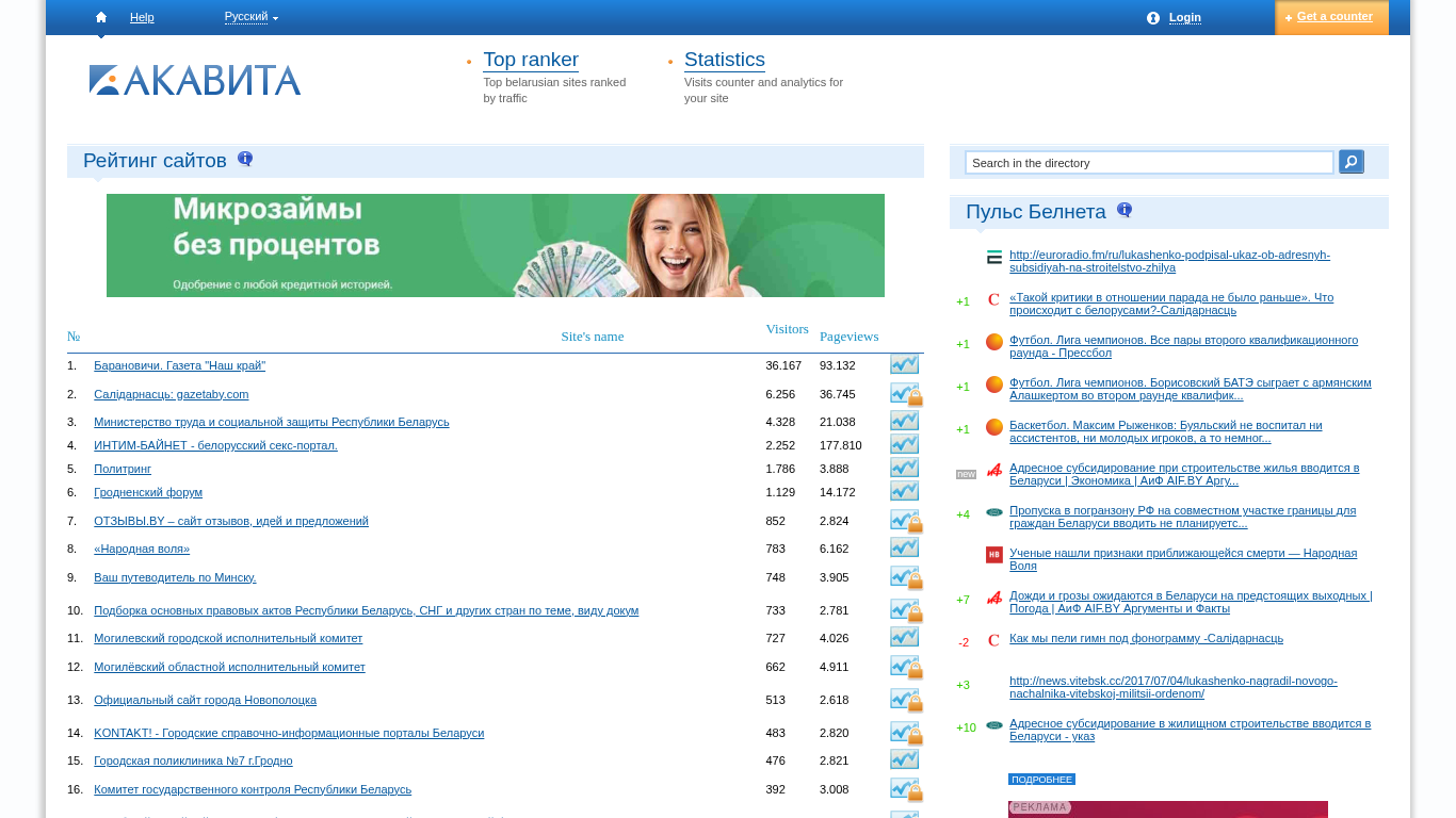 | AI-анализ | The website Akavita is a Belarusian statistics and analytics platform, providing data on top Belarusian sites ranked by traffic. It offers visitors unique statistics, including the number of visitors and pageviews, for various Belarusian sites. The site itself has had 30 unique visitors and 60 pageviews during the reporting period. Other top Belarusian sites, such as "Наш край" (Brest News), Salidarnascc: gazetaby.com, and the Ministry of Labor and Social Protection of Belarus, are listed with their respective visitor and pageview numbers. The site is accessible only to sites included in the Akavita rating. |