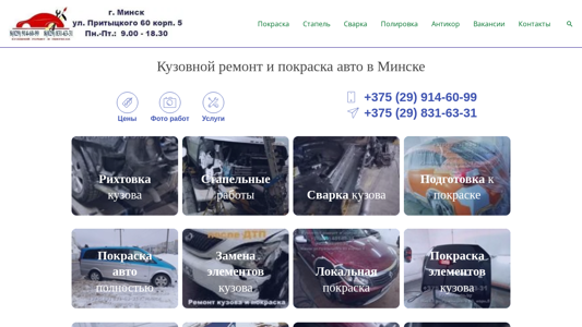 AI-анализ | This website is a car repair and painting service based in Minsk, Belarus, located at ul. Primytskogo 60, building 5. The business, named Стапель (Stapel), offers various auto repair services including bodywork, welding, painting, and anti-corrosion treatment. The website provides information on the services offered, such as bodywork preparation, full car painting, and element replacement. Customers can contact the business via phone at +375 (29) 914-60-99 or +375 (29) 831-63-31. The services are guaranteed. |