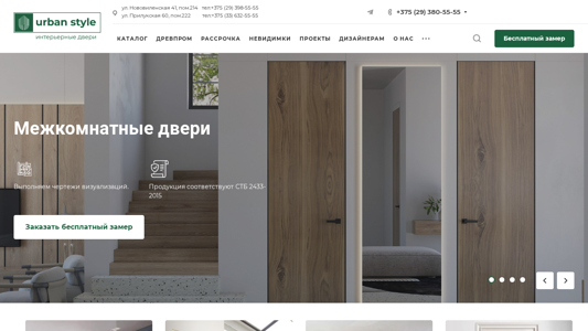 | AI-анализ | The web project "Urban Style" is a website dedicated to selling doors in Minsk, Belarus. It offers delivery and installation services, covering the entire country. The website features a 2-year warranty and financing options without interest for 8 months. Customers can contact the company via phone at +375 (33) 632-55-55 or email info@urbanstyle.by. The business operates Monday through Saturday from 10:00 to 20:00, Sundays from 10:00 to 18:00, and offers free measuring services. The catalog includes various types of doors such as hidden doors (invisible doors), aluminum doors, glossy doors, doors made of wood, doors made of ecological materials, glass doors, doors made of wood and paint, doors made of wood and enam |