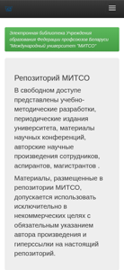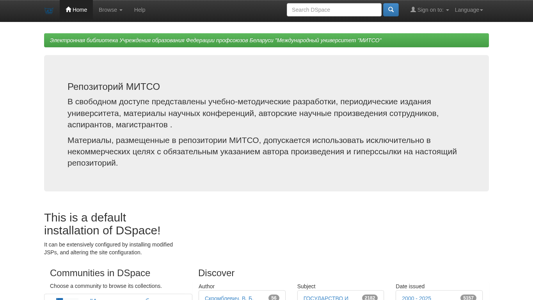 | AI-анализ | This online resource is the electronic library of the Educational Institution of the Federation of Trade Unions in Belarus "International University" MITSO. The homepage provides access to various communities and collections, including academic journals, scientific publications, and teaching materials. The site is based on DSpace, an open-source platform for digital content preservation and access. Materials in the repository can be used exclusively for non-commercial purposes with proper attribution and a link to the repository. The library covers a wide range of subjects, including law, economics, education, and international relations. The site is available at elib.mitso.by. |