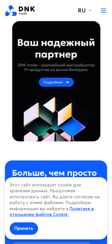 | AI-анализ | The web project "DNK Трейд" is the largest distributor of IT products in the Belarusian market, offering a full range of services including market analysis, supply and certification, service and warranty support, product promotion, merchandising, and partner development. The company's core values are professional staff, partnerships, and the provision of quality and innovative products and services. The website provides news updates, information on product categories, and contact details for customer service centers. Brands offered include consumer electronics, electronic products and services, software and subscriptions, corporate products and components, printing technology, network equipment, external storage, computer peripherals, and components. The company is an LLC named "DNK Трейд" with a postal address at Minsk, Minskaya oblast, Minskaya oblast, 223021, Minsk, Minskaya |