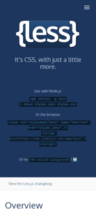 | AI-анализ | The website lesscss.org is the official documentation for Less.js, a CSS extension that adds variables, mixins, operations, and functions to the CSS language. Less is designed to be used both on the server-side with Node.js and Rhino, and on the client-side with modern browsers. The site provides comprehensive documentation on the Less language and Less.js, including an overview, features, functions, and usage instructions. The website also offers tools and resources for working with Less, as well as a GitHub repository and issue tracker. The site is well-organized and easy to navigate, with clear headings, a search function, and a simple layout. The content is written in a clear and concise manner, making it accessible to both beginners and experienced developers. The site's design is functional and uncluttered, with a focus on providing accurate and up-to-date information about |