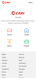 | AI-анализ | The web project "Cari.com.co" is a Colombian marketplace for buying and selling used cars, motorcycles, houses, jobs, and careers. The website offers a search function for these items in major Colombian cities, including Bogota, Ecatepec, Guadalajara, Puebla, Leon, Juarez, Tijuana, Zapopan, Monterrey, Nezahualcoyotl, Chihuahua, and throughout Colombia. The site includes sections for cars, motorcycles, houses, employment, and Colombia, with a menu for easy navigation. It also provides an option to search in other countries, including Algeria, Angola, Argentina, Australia, Austria, Bangladesh, Belarus, Belgium, Bolivia, Brazil, Burkina Faso, Cambodia, Cameroon, Canada, Chile, Colombia, |