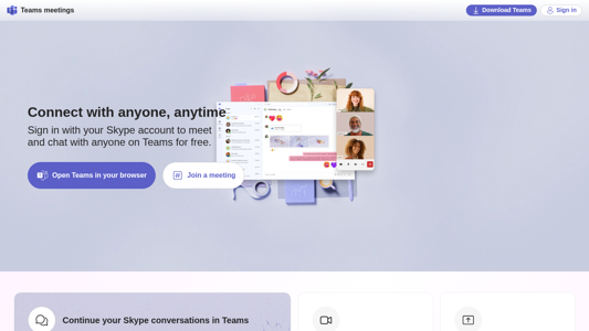 | AI-анализ | The website, titled "Free Online Meetings & Video Calls | Microsoft Teams," offers users the ability to start free video calls and connect with others for collaboration and communication. Key features include video calls, chat, file sharing, and more. It is suitable for various groups such as personal use, freelancers, teachers, PTAs, small businesses, and social events. Users can download the Teams app or join a meeting directly in their browser. Meetings can be joined using a meeting ID and can be scheduled or instant. Collaborative tools include screen sharing, live captions, and interactive emojis. Users can also continue their Skype conversations in Teams. The website is available on Skype.com. |