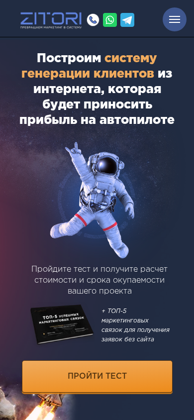 | AI-анализ | The web project "Поток новых клиентов для вашего бизнеса - ООО "Зитори Групп" (Zitori Group LLC) is a business-oriented website, providing services related to client generation, education, and marketing. The site offers a test to calculate the cost and return on investment for a project, as well as various marketing solutions. These include setting up a contextual ad campaign in Yandex Direct and Google Ads, creating a quiz-landing page, and developing a sales website. The quiz-landing page is designed to generate leads through a questionnaire on a one-page site, with a conversion rate of 10-20% compared to 1% for an internet store or 4-7% for a landing page. The site also offers chatbot integration in messaging apps to attract twice as many clients. Contact information for |