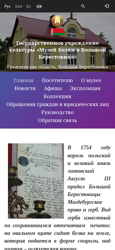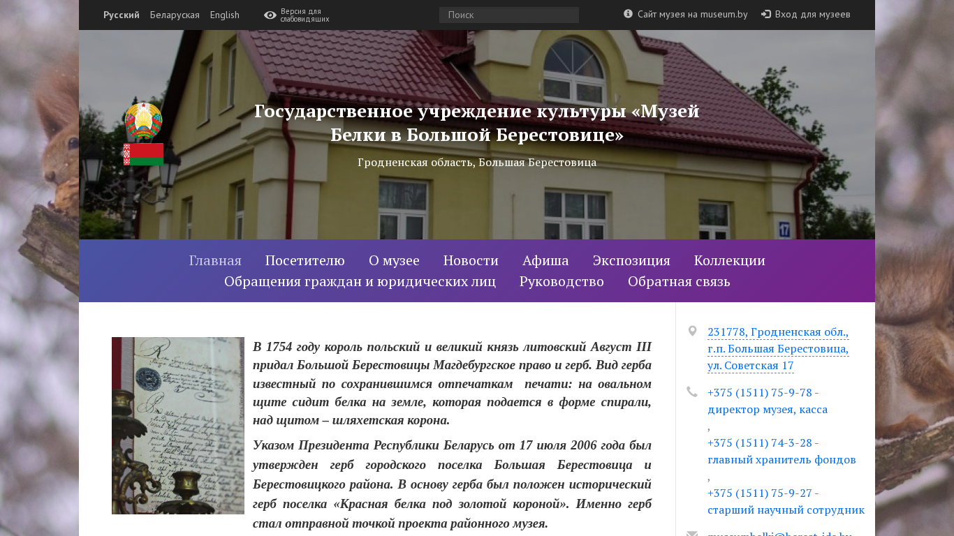 | SEO-описание | Государственное учреждение культуры «Музей Белки в Большой Берестовице» — новости и афиша мероприятий, информация для посетителей, цены, экспозиция, коллекции, материалы для музейщиков. |