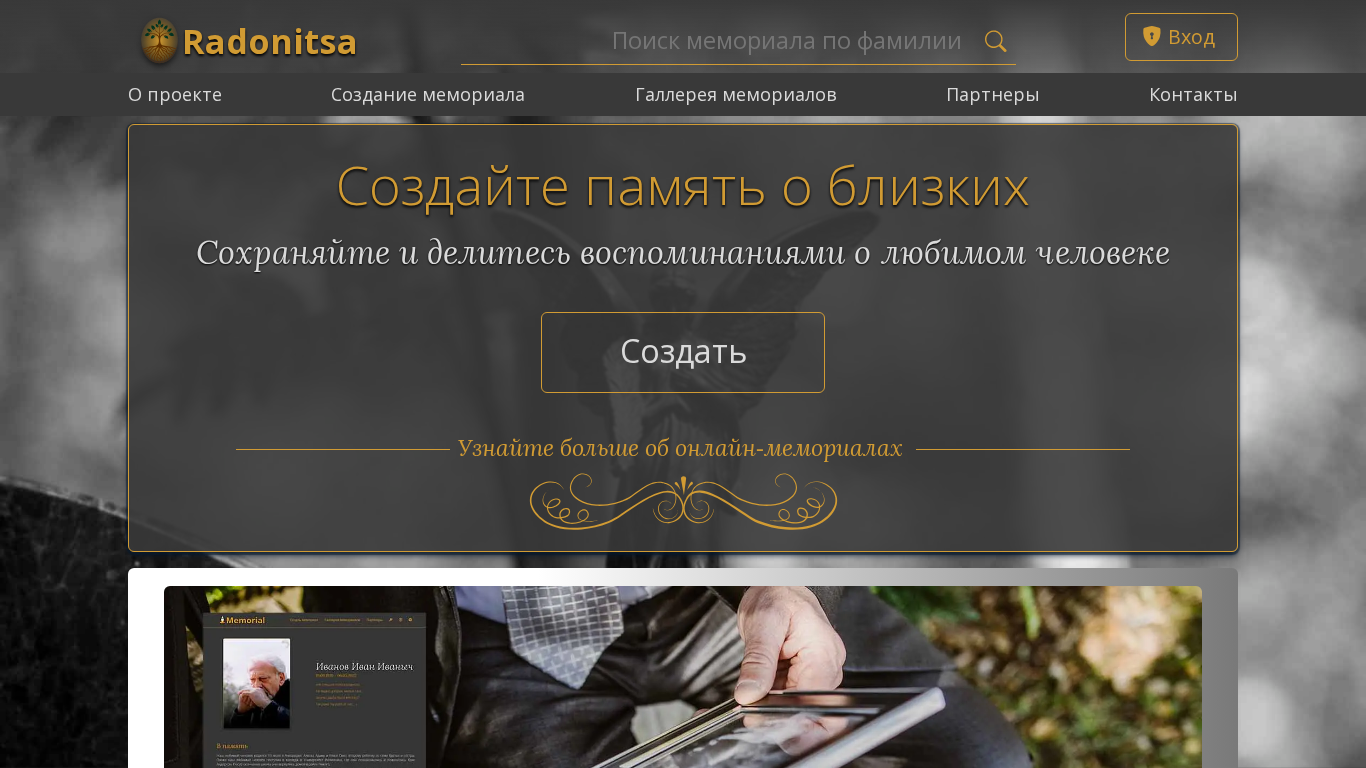 | SEO-описание | Сайт памяти о Ваших близких. Пригласите друзей и родственников оставить дань уважения, поделиться воспоминаниям, фотографии и видео. |