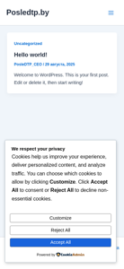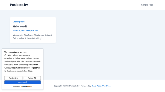 | AI-анализ | language: ru The web project Posledtp.by is a WordPress blog. The website title is "Posledtp.by" and the description is "My WordPress Blog". The site contains a menu with a "Sample Page" and an "Uncategorized" section. The homepage displays a welcome message and a copyright notice. The website uses the Astra WordPress theme. A cookie notice appears, informing users about the use of cookies for site functionality, personalization, and analysis. Users can customize their cookie preferences, including accepting or rejecting non-essential cookies. The site does not currently use any cookies for necessary, functional, analytical, or advertisement purposes. Unclassified cookies are also present. |