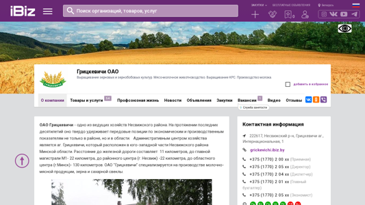 | AI-анализ | The web project "Grickevichi OAO" is a Belarusian agricultural company specializing in the production of milk, meat, and crops. The company is located in the village of Grickevichi, which is 11 km away from the railway, 22 km from the main highway M1, 22 km from the district center Nezhish, and 130 km from the regional center Minsk. Grickevichi OAO grows cereal crops such as wheat, barley, and corn, as well as sugar beets. The company has consistently won awards for high crop yields in both the district and the region. As of January 1, 2025, the company employed 238 people, with 35 of them being young workers under the age of 31. The company fully retains new young specialists who join |