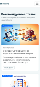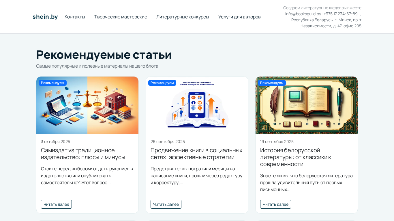 | AI-анализ | This website is a literary and publishing platform, with a focus on providing resources and recommendations for authors. The title is "shein.by" and the description includes keywords related to literature, writing, and publishing. The top words indicate popular topics such as "Samizdat vs traditional publishing," "promoting books on social media," and "history of Belarusian literature." The website also offers contacts and services for authors, including literary masterclasses and contests. The content is updated twice a week, with articles on various aspects of writing and publishing. |