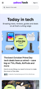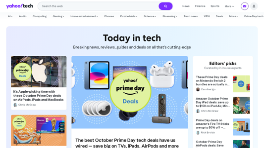 | AI-анализ | language: en The portal tech.yahoo.com, titled "Yahoo Tech," provides technology news, updates, and reviews. Users can search the web for technology-related content, including news, finance, sports, and more. The website features sections on AI, Apple, streaming, tech news, and deals. Key topics include streaming reviews, tech news, VPN deals, apps, and home entertainment. The editors curate "Editors' picks" and "Curated by in-house experts." October Prime Day deals are prominently displayed, offering savings on TVs, iPads, AirPods, and other tech products. |