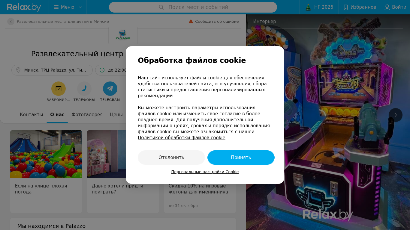 | AI-анализ | The web project Mi mi land (Ми ми лэнд) is a children's entertainment center located in the Central district of Minsk, inside the Palazzo shopping and entertainment complex, at the address Тимирязева, 74А, unit 3. The center operates daily from 10:00 and welcomes visitors without age restrictions. Admission is free, and services are paid based on selected activities: the gaming zone requires tokens for arcade machines, and the activity zone operates on tickets (for an hour or all-day passes). The center features two main areas: the gaming zone includes large bouncy castles, a labyrinth, a volcano mountain, a dry pool with balls, and various toys, designed for active and safe leisure. Children under 6 years old must be accompanied by adults. Upon entry, visitors receive a bracelet-ticket (for |