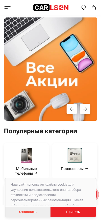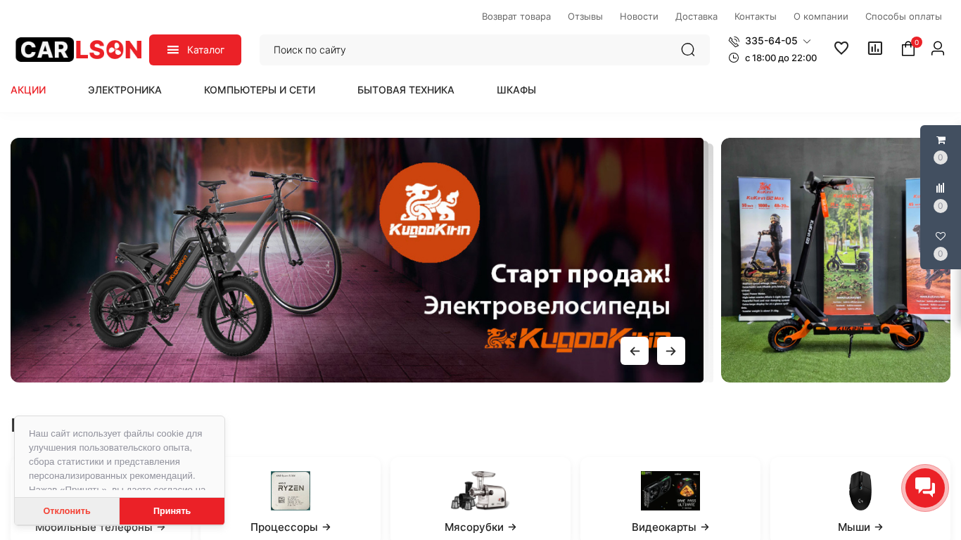 | AI-анализ | language: ru This website is an online electronics and home appliances store called Carlson.by. The main focus of the store is on selling electric scooters and electric bicycles. Users can browse and purchase items directly from the website, with options for comparing products and saving favorites for later purchase. The site also features a shopping cart, customer reviews, and news sections. It uses cookies for improving user experience, data collection, and personalized recommendations. The contact information includes a phone number, email address, and social media links. The store offers a return policy and various delivery methods. Popular product categories include electronics, computers, and home appliances. The site operates from 18:00 to 22:00 and offers various payment and financing options. |