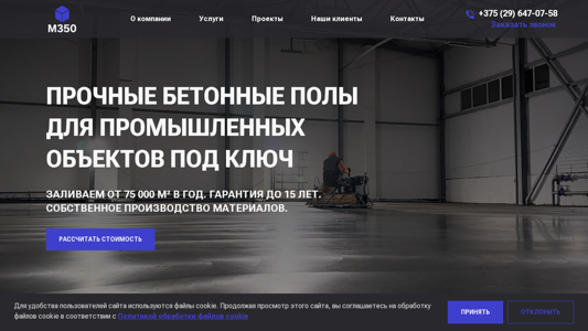 | AI-анализ | The website m350.by is dedicated to providing industrial-grade concrete floors for clients under a turnkey contract. The company offers flooring services for residential, commercial, and industrial buildings, including the preparation of foundations, application of polymeric coatings, and repair of existing concrete floors. The site boasts a production capacity of 75,000 square meters per year, with a guarantee of up to 15 years on their concrete flooring solutions. The website provides a contact number, +375 (29) 647-07-58, for inquiries and requests for quotes. The company has been in business for over 11 years, specializing in creating durable, reliable, and long-lasting flooring solutions for heavy machinery, high loads, and harsh environments. Their clientele includes large factories, warehouses, logistics centers, and |