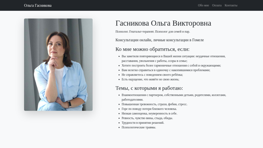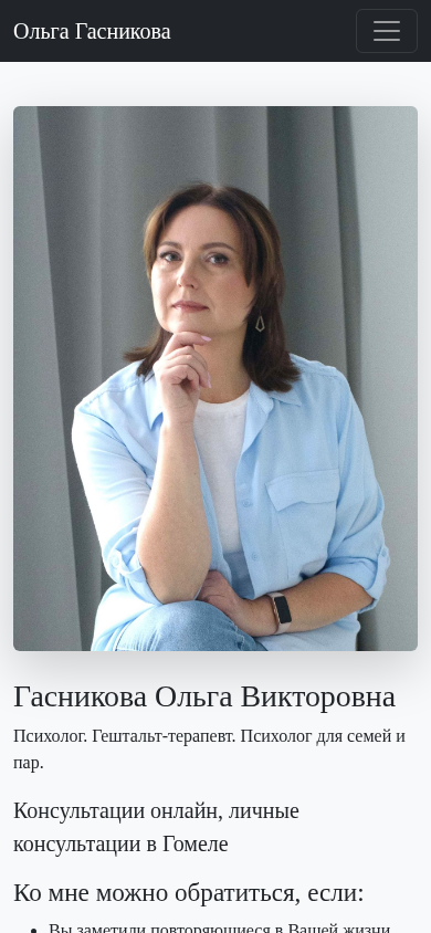 | SEO-описание | Психолог Ольга Гасникова в Гомеле: индивидуальные и семейные консультации, гештальт-терапия. Решение проблем с тревожностью, отношениями, самооценкой. |