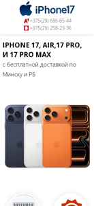 | AI-анализ | The portal offers a range of original iPhone 17, 17 Air, 17 Pro, and 17 Pro Max for sale in Minsk with an installment plan using the Halka card. Customers can purchase these models at low prices, with free shipping across Belarus. The website provides a three-year warranty. Customers can select from various colors, including white, blue, green, pink, and black. The portal offers iPhone models with 256GB, 3350 rubles, and 512GB, 4888 rubles, in addition to Air models. The website accepts various payment methods, including cash on delivery, online banking, Bitcoin, and others. The discount on iPhone 17 and iPhone Air applies until October 8, 2025. The portal allows customers to choose from various color options for the iPhone 17 |