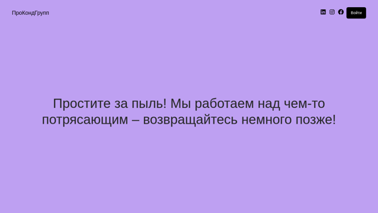 | AI-анализ | The website ProKondGroup.by has a title "ПроКондГрупп" and a description with the words "прокондгрупп", "LinkedIn", "Instagram", "Facebook", "войти", "простите", "пыль", "работаем", "над", "чем-то", "потрясающим", "возвращайтесь", "немного", and "позже" appearing as top_words. The fragment of the page includes the phrases "ПроКондГрупп", "LinkedIn", "Instagram", "Facebook", "Войти", "Простите за пыль!", "Мы работаем над чем-то потрясающим", "возвращайтесь немного позже!". The website is located |