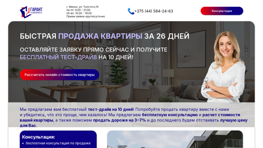 | AI-анализ | This online resource is a Belarusian real estate website offering assistance in selling apartments. The title of the webpage is "Key to a Successful Sale of an Apartment in Just 26 Days!" The description promises a free 10-day test-drive, where users can try selling their apartment with the help of the website. Additionally, the website offers a free consultation and valuation of the user's apartment, aiming to sell it for a higher price and defending the best possible price for the user. The website also allows users to input their apartment's number of rooms, district in Minsk, their name, and phone number for a valuation. The data reveals that the keywords include "appraisal," "online calculator," "price of apartment," and "free appraisal," among others. The top words are "data," "personal," "our," "days," and "number." |