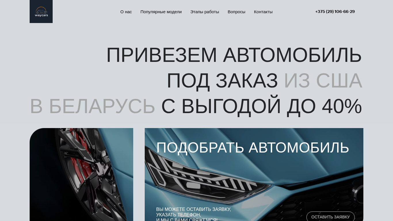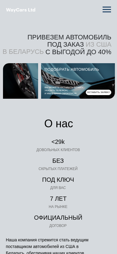 | AI-анализ | The website WayCars LTD is an automobile sales platform based in Belarus. The site offers vehicles imported from the US with significant discounts for local buyers. The title is "WayCars LTD" and the description includes keywords related to the auto market, years, looking, ordering, engine size, and fuel type. The most frequently used words on the site are "vas" (which translates to 'you' in English), "рынке" (market), "000," "2021," "посмотреть" (look), "заказ" (order), "год," "привод" (drive train), "пробег" (mileage), "миль" (mile), "коробка" (transmission), "автомат" (automatic), "двигатель" (engine), "оформить" (register |