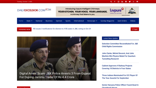 | AI-анализ | This online resource, Daily Excelsior, is a news platform dedicated to providing the latest updates on events and affairs in Jammu Kashmir and Ladakh. With a focus on state news, the website covers a range of topics including business, sports, international news, and horoscopes. Users can navigate through sections such as National, Business, Opinion, Sports, International, Horoscope, Daily Horoscope, Weekly Horoscope, Sunday Magazine, Govt Orders, and Videos. The website also includes a search function and trending news. As of October 7, 2025, the homepage features stories on the EC announcing by-elections, SC seeking Centre and Ladakh UT's response, RO issuing notifications for elections, rain causing temperature drops and pass closures in J&K, and the completion of natural gas pipeline work in Kath |