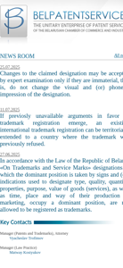 | AI-анализ | This website, titled "Belpatentservice" and described as offering "intellectual property rights protection in Belarus," provides information about trademarks and patents, as well as the services of Belarusian patent attorneys. Keywords include "Belpatentservice," "intellectual property rights protection," "trademarks and patents," and "Belarusian patent attorneys." The top_words indicate sections such as "About Us," "Publications," "News," "Services," "Patents & Trademarks," "Law Practice," "Economics," "Depositing," "Online Request," "Trademark Patent Depositing," "Other Services," "IP Guide," "IP Rights Regulations," "Enforcement," "Partners," "Careers," and "Contacts." The NEWS ROOM section includes articles on changes to trademark |