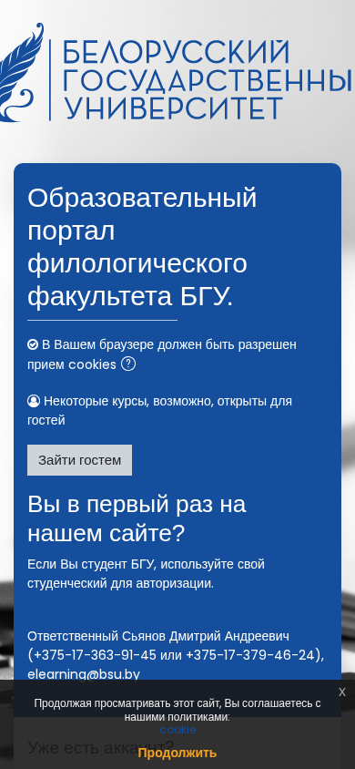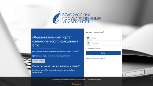 | AI-анализ | The web project "Eduphil.bsu.by" is an educational portal of the philological faculty at BGU. The site requires cookie acceptance in the user's browser to access its content. Some courses may be open to guests. New users who are students of BGU should use their student ID for authentication. The contact details for support are (+375-17-363-91-45 or +375-17-379-46-24), and the email address is e-learning@bsu.by. Returning users can log in with their credentials, and there is an option to remember the login. Forgotten login or password information can be retrieved via the site. Users continue to browse the site agreeing to the site's cookie policy. |