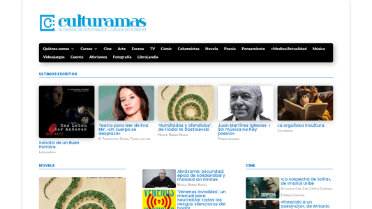 | AI-анализ | This website is a Spanish-language cultural platform dedicated to literature, cinema, art, and other forms of creative expression. It features reviews, columns, and courses on various topics, including novels, poetry, theatre, music, video games, and more. The website's title is "Culturamas" and it includes sections for novels, poetry, theatre, TV, comic books, and multimedia. Some of the featured works include "Sonata de un Buen Hombre," "Humillados y ofendidos," and "Astrofísica para ansiosos." The website also offers a curso avanzado de narrativa (advanced narrative course) and a section for last writings. |